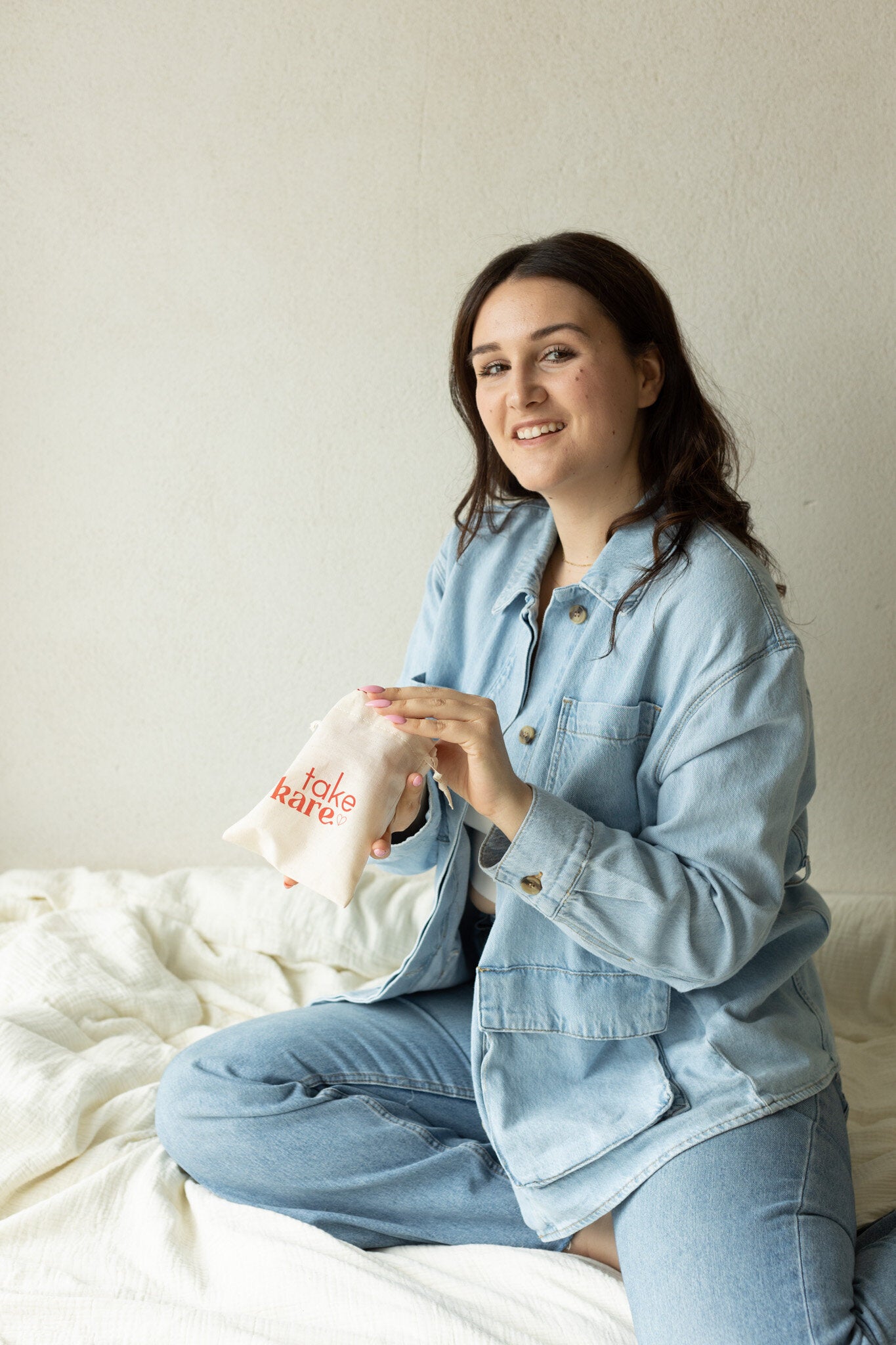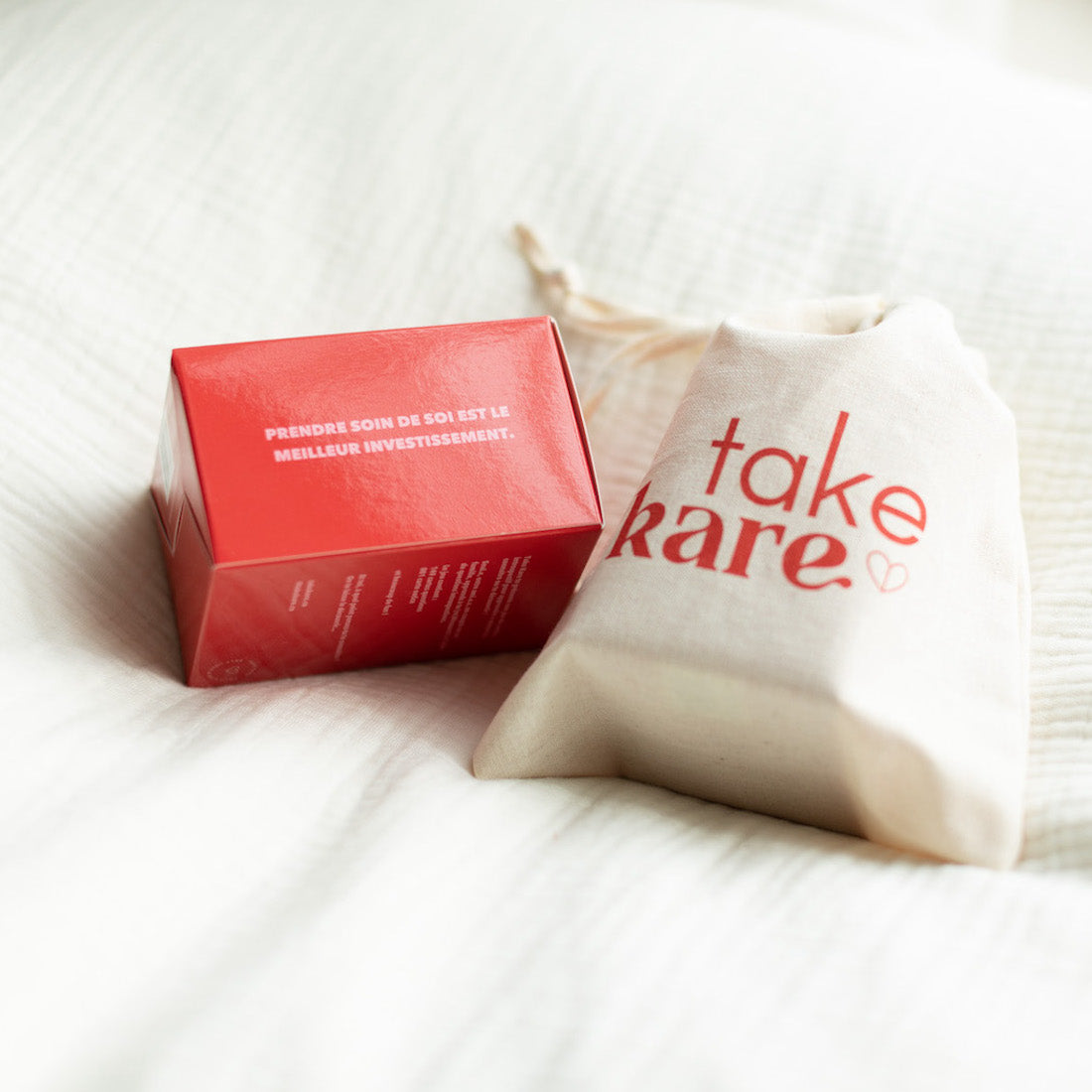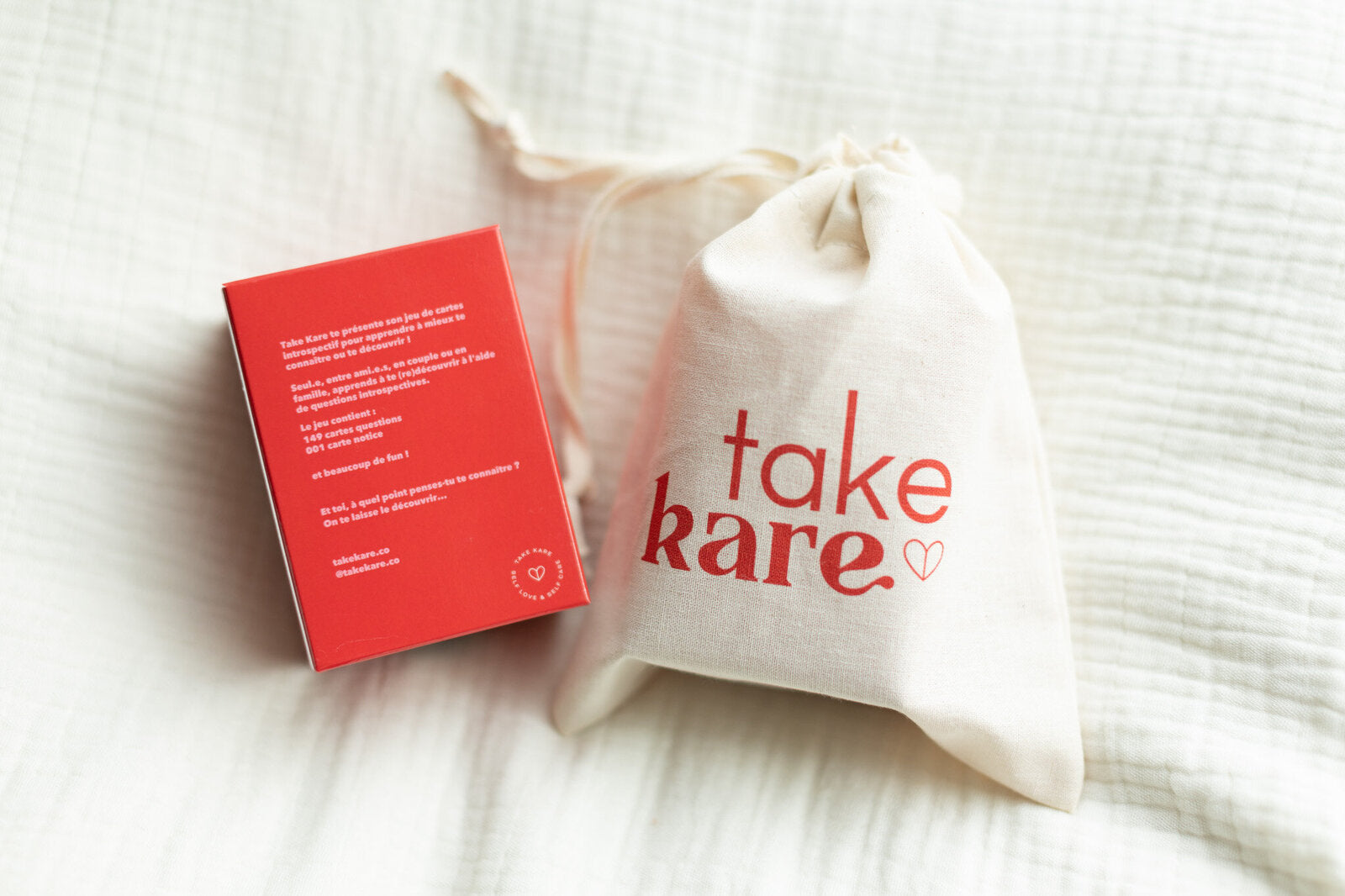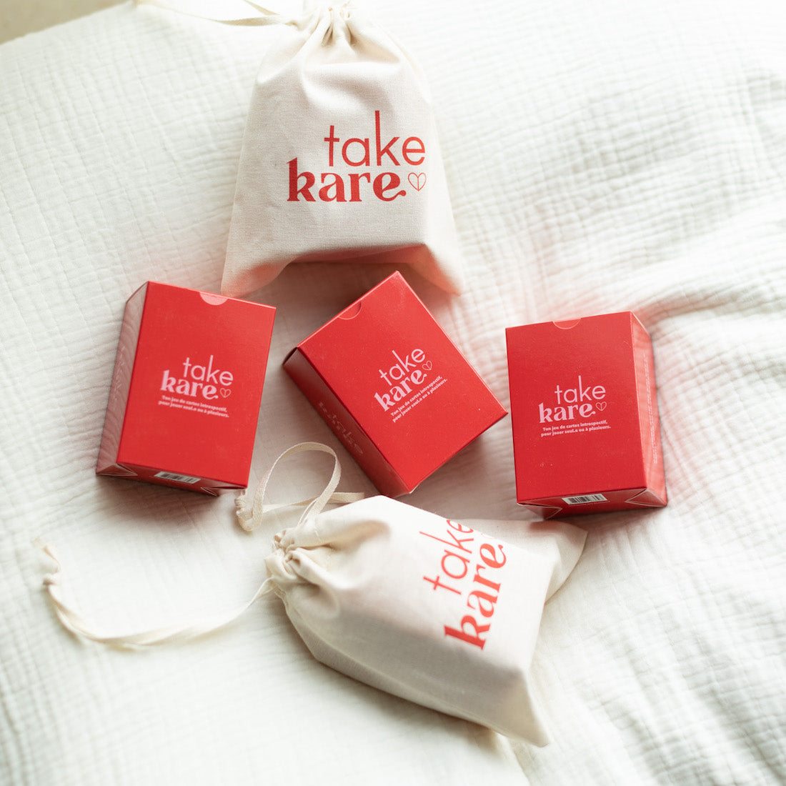 Ce petit sac en coton Oeko-tex fabriqué en Espagne fera également un joli petit paquet cadeau pour offrir le jeu de cartes Take Kare et y glisser un petit mot !